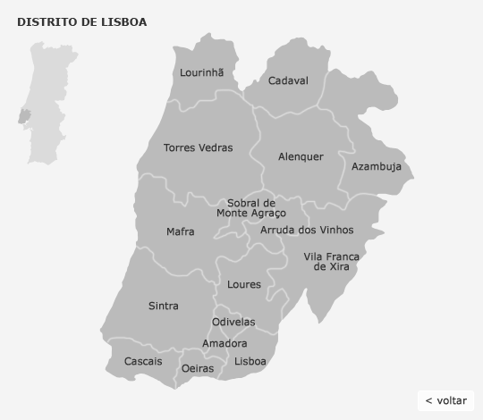 Sintra Cascais Oeiras Lisboa Amadora Odivelas Loures Vila Franca de Xira Arruda dos Vinhos Sobral de Monte Agraço Mafra Torres Vedras Alenquer Azambuja Cadaval Lourinhã Voltar Voltar ao Mapa de Portugal