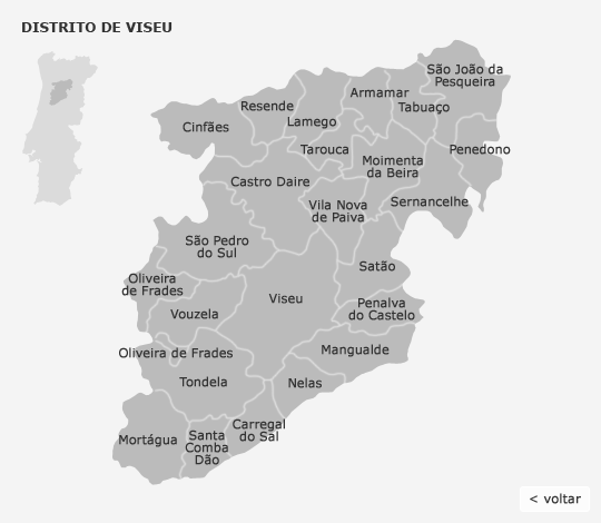 São João da Pesqueira Mangualde Oliveira de Frades Carregal do Sal Satão Tondela Viseu Nelas Penalva do Castelo Vila Nova de Paiva Oliveira de Frades Vouzela Sernancelhe Moimenta da Beira Castro Daire São Pedro do Sul Armamar Lamego Penedono Cinfães Mortágua Santa Comba Dão Tabuaço Resende Tarouca Voltar Voltar ao Mapa de Portugal